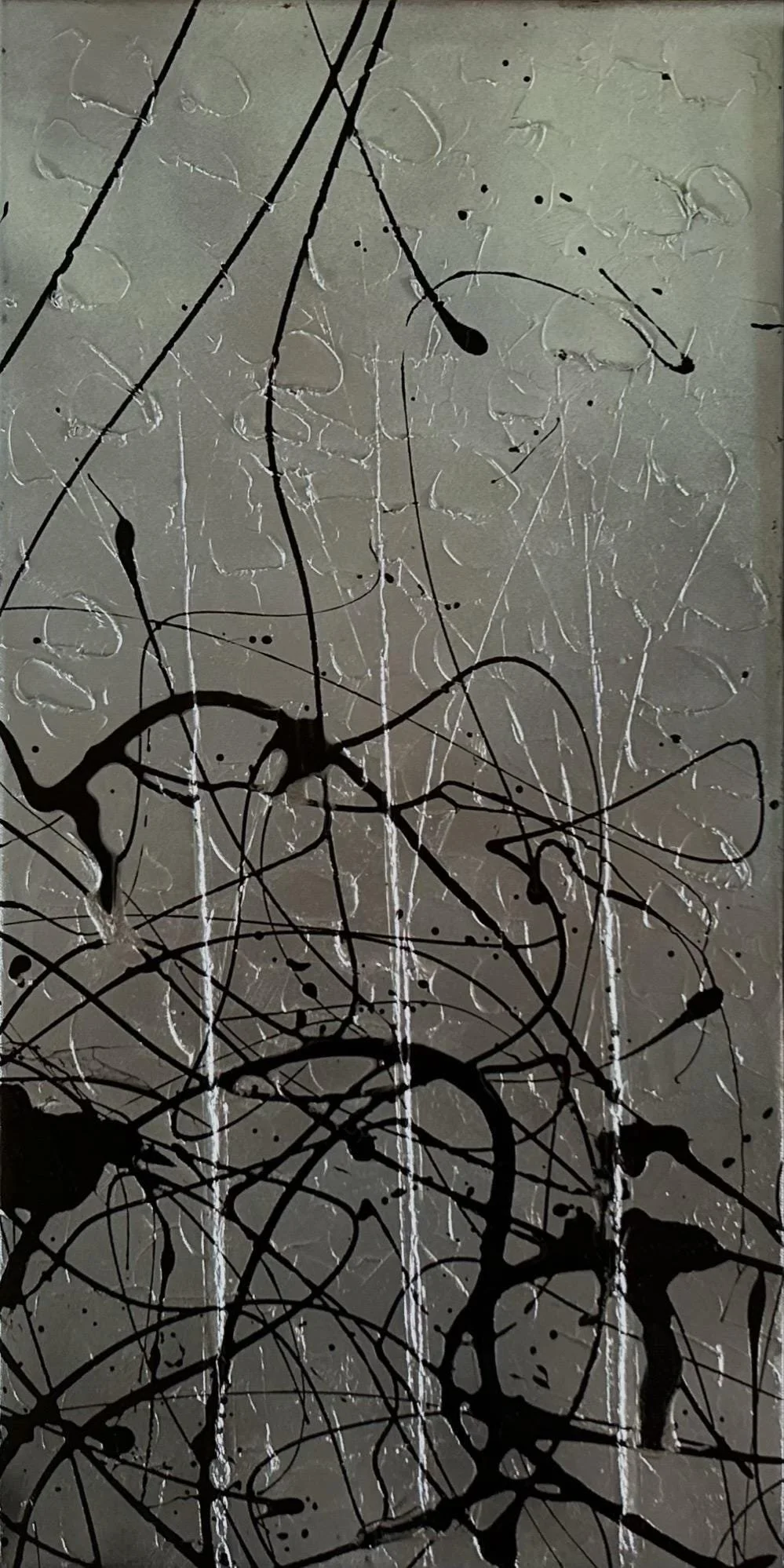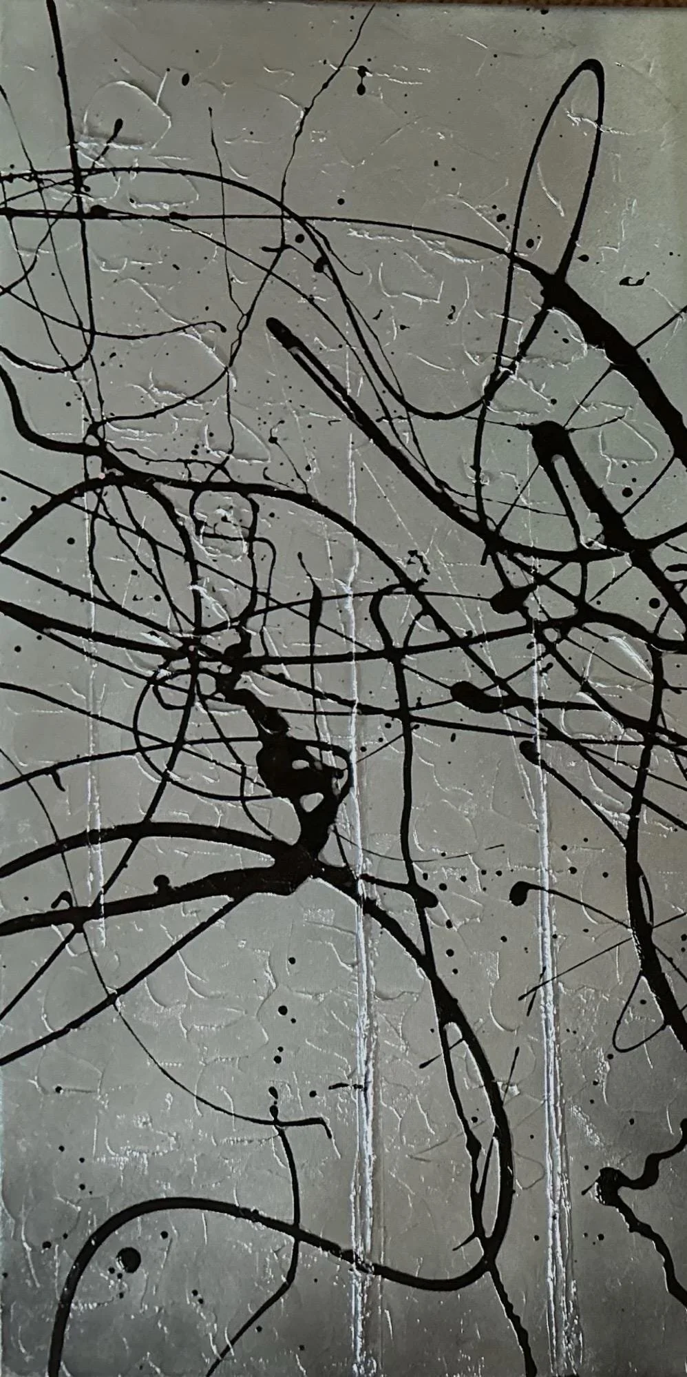 3 Panel 12x24 Acrylic Latex Mixed Media Abstract Painting Local IL Artist Dynamic lines loop and coil, creating an abstract dance of latex against a metallic silver backdrop with lots of dimensional texture.